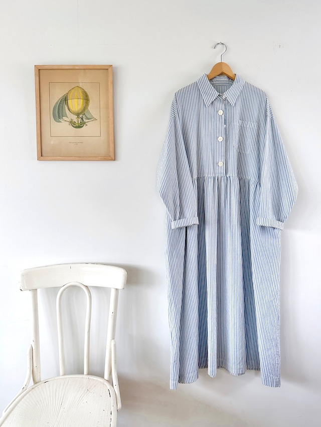 細かな織り柄模様の入ったストライプ生地に 洗い加工がされた、ナチュラルな風合いが 素敵なワンピース* "Rachel"というモデルの ウエストで切り替えになった ゆるりとしたシャツワンピースは、 360度どの角度からも素敵で 雰囲気たっぷりの一着。 薄手の柔らかくドライな肌触りで、 夏場に長袖を着たい方にも 気持ちよく着ていただけそう。 爽やかなネイビーのストライプは 重ね着したときも爽やかに馴染んでくれて コーディネートの幅を広げてくれます。 長く愛用したい、素敵な一着です。 着用スタッフ158センチ 素材 綿100% サイズ F 着丈120 身幅65 裄丈78 日本製