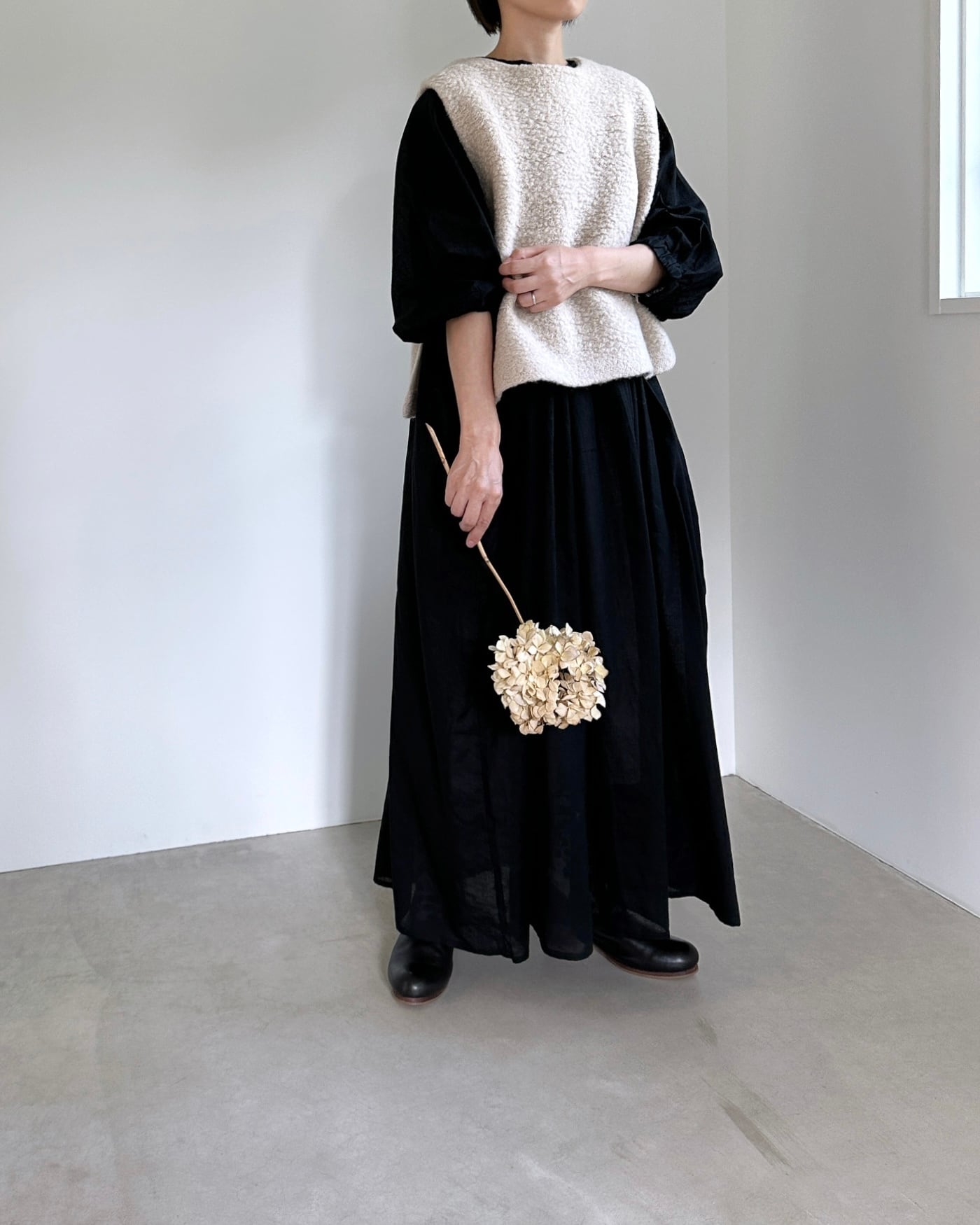 ギャザーをほどこした分量感のあるシルエットが