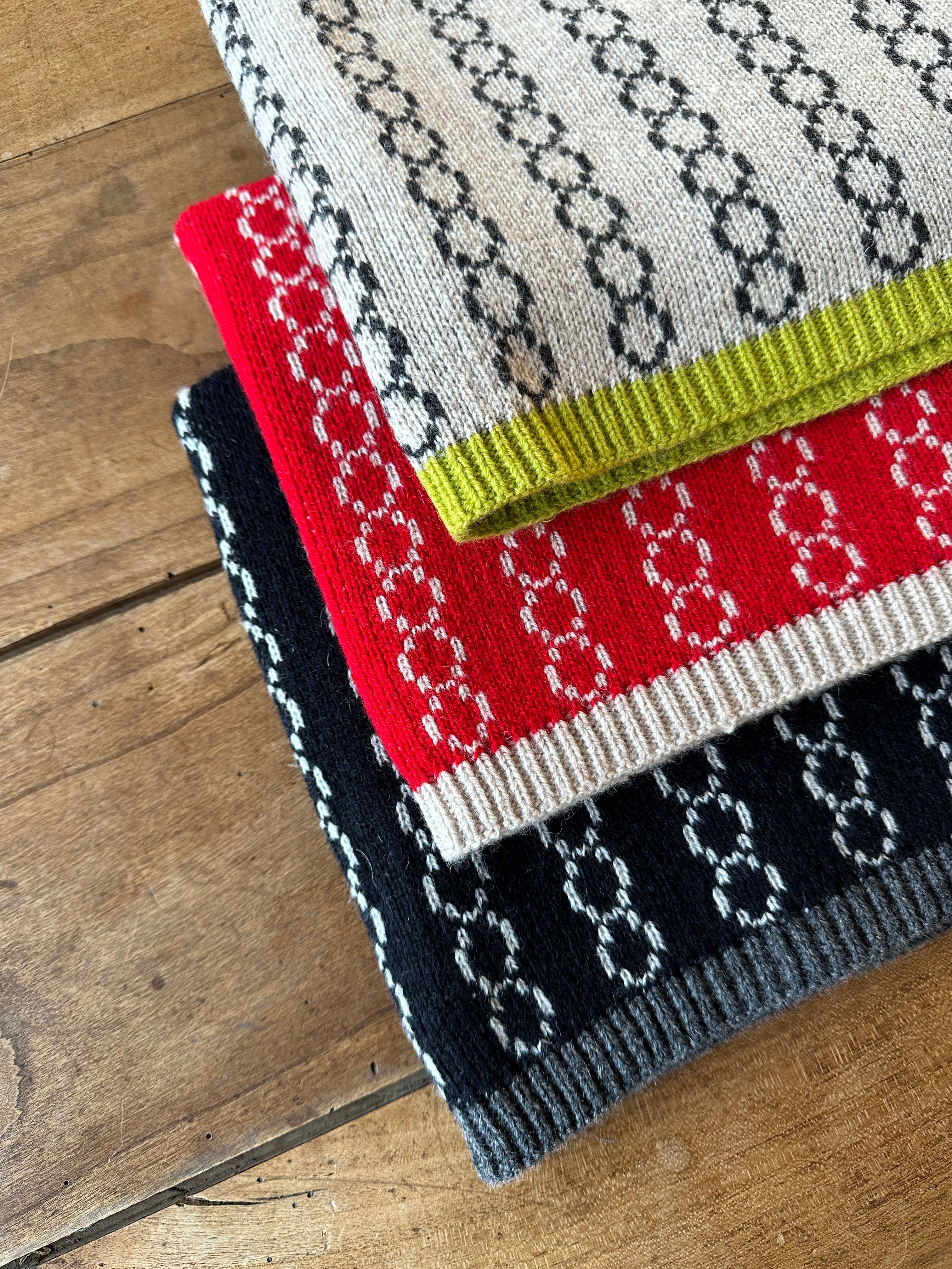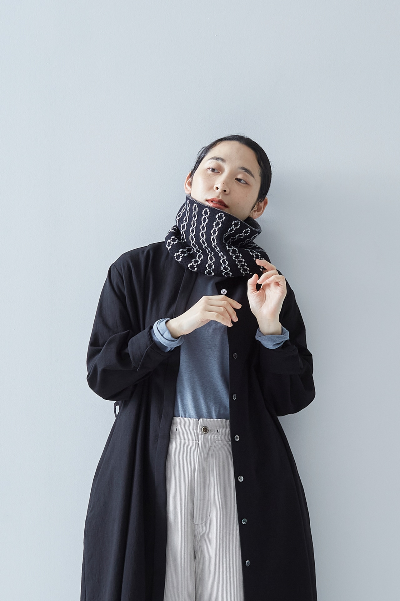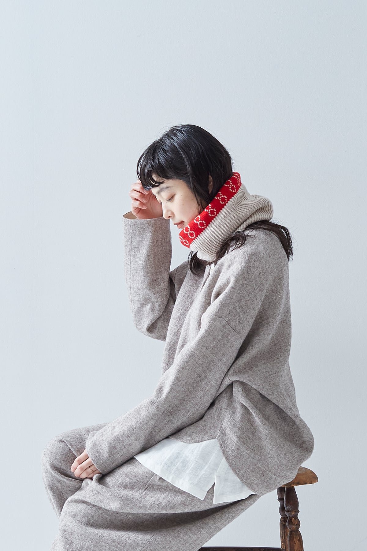 ・リブとジャガードの境目をふたつ折にして、首からかぶる仕様のかわいい防寒アイテムです。