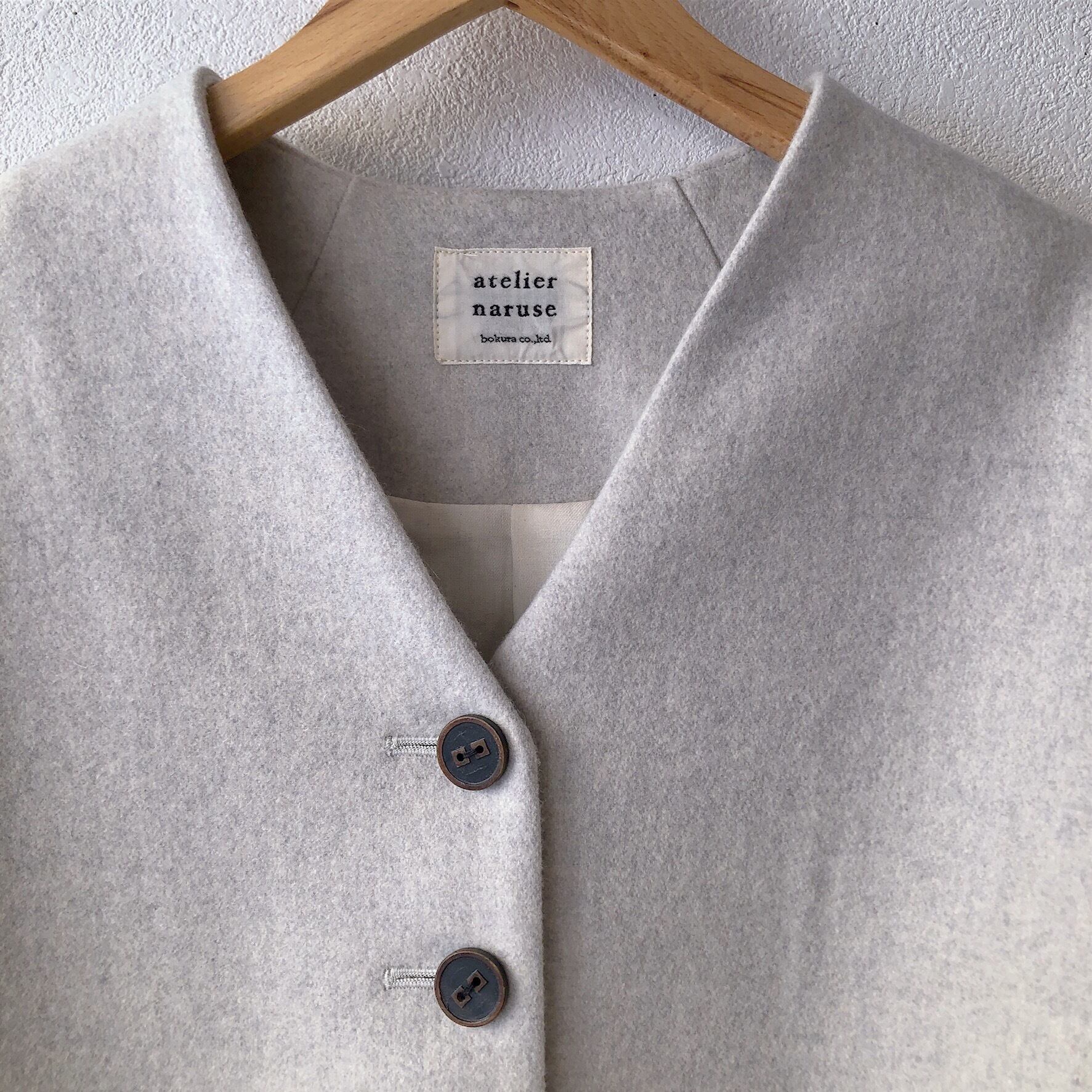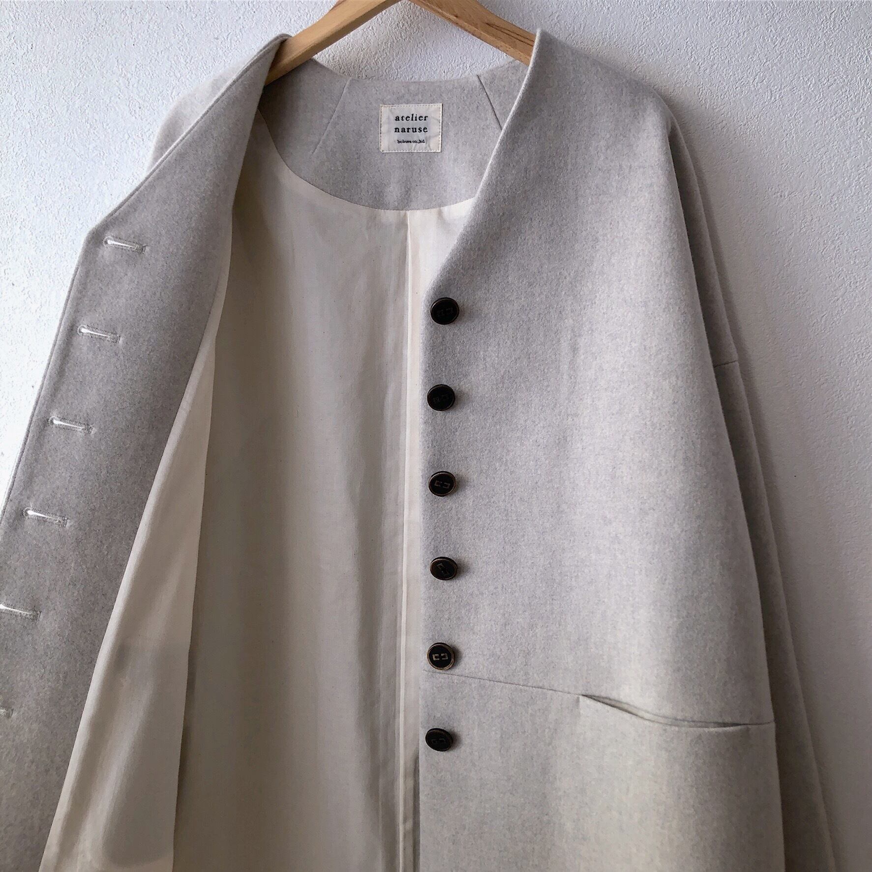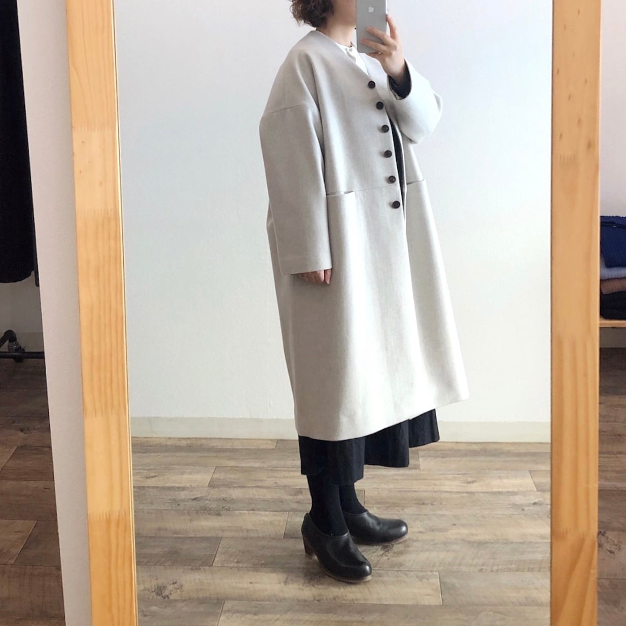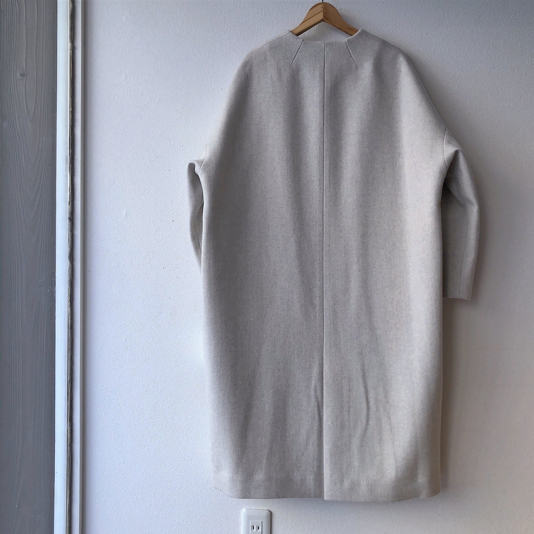 立体的なフォルム。身巾、袖巾ともにおおきくゆったりとしたオーバーサイズ感。首にそうように少しだけハイネックになったV明き。フロント左右の切りポケット。そして、フロントの左見返しには内ポケットをつけた、上質な一生もののウールコートに仕立てています。
